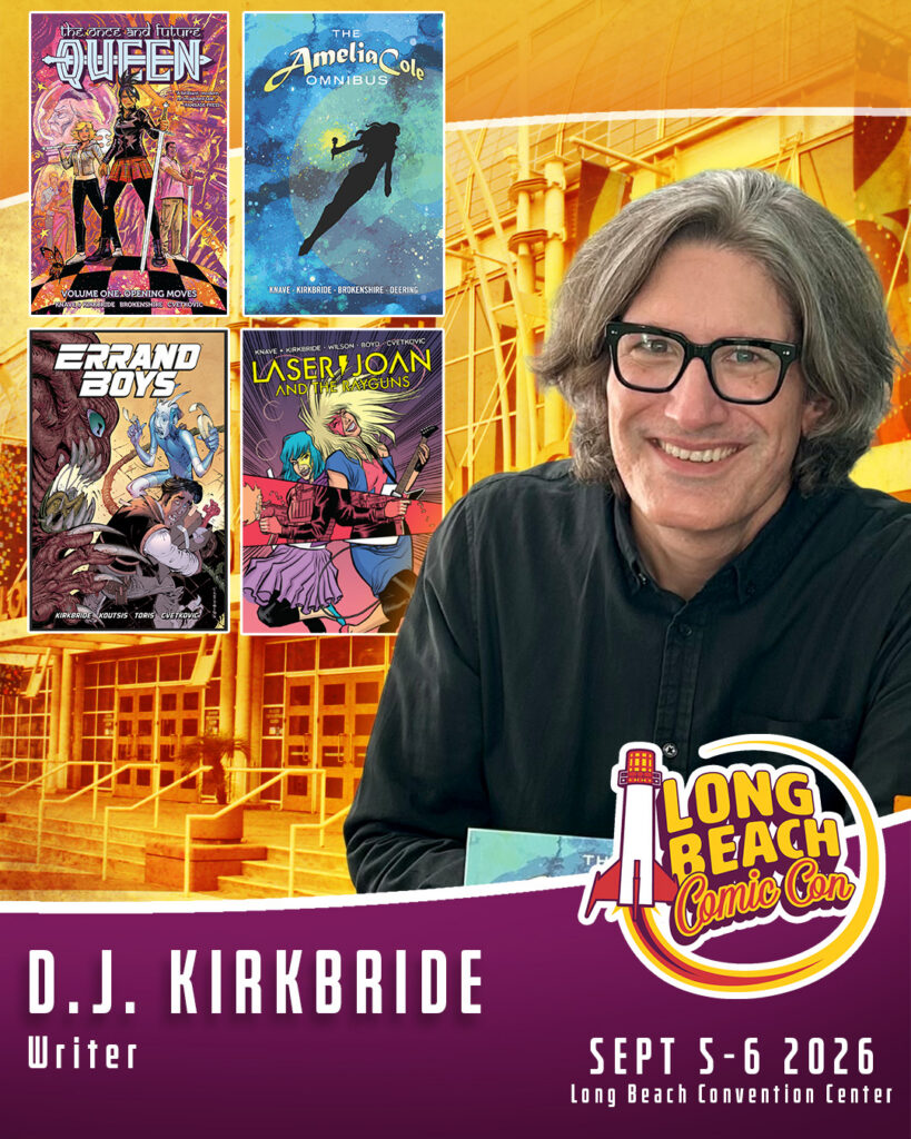 D.J. Kirkbride got his start in comics as an editor and writer on Image Comics’ Eisner and Harvey Award-winning Popgun anthologies. After those, he co-wrote the acclaimed fantasy series Amelia Cole, which was part of the Monkeybrain Comics digital launch on ComiXology, published in print by IDW Publishing. Kirkbride is also the author of the cosmic space opera The Bigger Bang and its sequel, The Biggest Bang, also published by IDW. He co-wrote a modern reimagining of the King Arthur saga called The Once and Future Queen, the superhero drama Never Ending, and the Dark Horse Presents rock ‘n roll action feature “Laser Joan and the Rayguns,” all published by Dark Horse Comics. A story he co-wrote also appeared in Heavy Metal Magazine #297. His latest comic book is the sci-fi adventure series Errand Boys, which was published as singles issues by Image Comics and collected as a trade paperback by Dark Horse Comics.